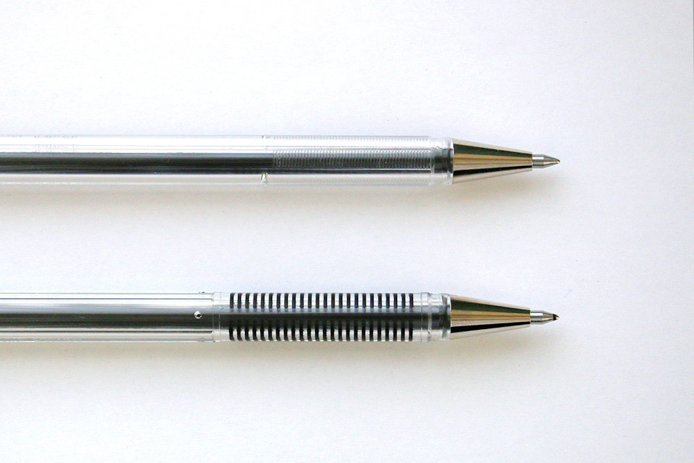 これまでにない中性ボールペンをボディでも表現するため、ボディとキャップにはクリアな透明スタイルを採用している。キャップを透明にしたのは、この「ハイブリッド」が初めてだという。