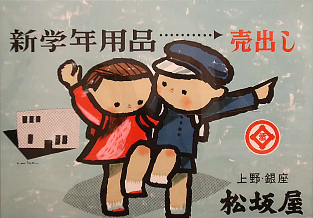 当時、ぺんてる宣伝部に在籍していた従業員の若井 登さんは、地下鉄に乗っていた。すると、一枚の中吊り広告が目に飛び込んできた。それは、松坂屋デパートが学童用品を売り出すという広告だった。男の子と女の子が元気よく描かれていたものだ。戦後間もない世の中が暗い雰囲気だった時代だけに明るい色で描かれた元気な子供の姿は、これからの日本を象徴するかのように躍動感にあふれていた。この絵を描いたのが、当時松坂屋デパート宣伝部に在籍していた宮永さんだった。