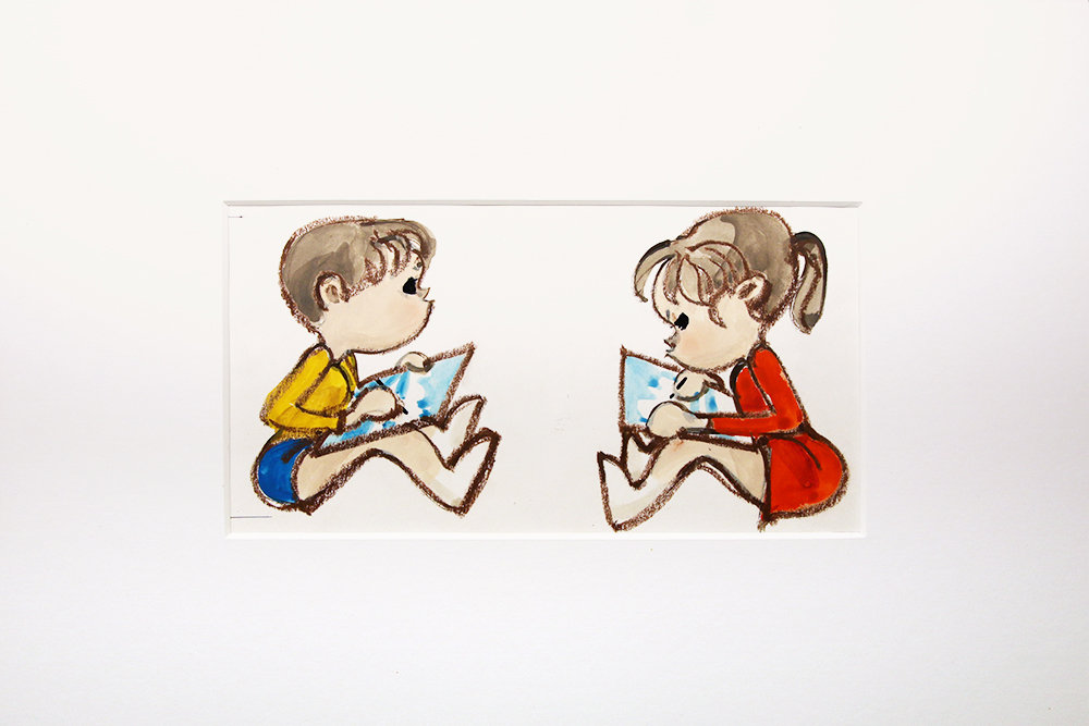 出来上がった絵は、男の子と女の子が楽しそうに絵を描いているもので、ぺんてる描画材にピッタリとくる童画であった。実は、一番最初の「ぺぺ&ルル」の絵は、パッケージではなく、ポスターとして描かれたものだった。
