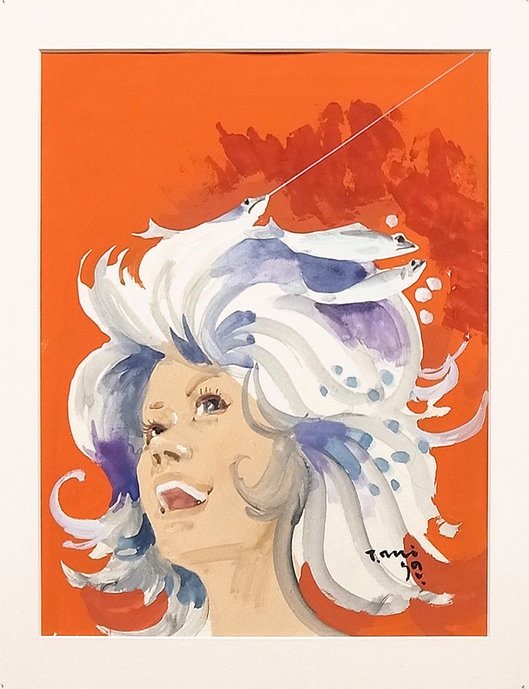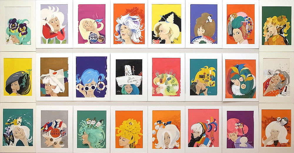 女性の様々な表情がPOPに楽しく描かれている。よくよく見てみると、髪が葉っぱだったり、魚やアイスクリームだったり、あるはずもないシチュエーションなのに、見ていて不思議としっくりとくる。週刊誌ということで、髪で季節感を表現していたようだ。