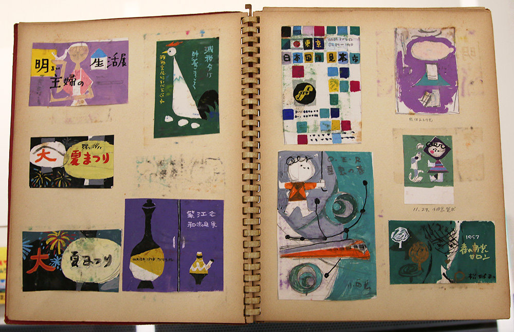 宮永さんのこうした旺盛な仕事ぶりは、作品点数にとどまらない。現在のポスター制作と言えば、全体を監督するアートディレクターを中心にイラストレーターやコピーライターといった人たちが共同で制作していくが、宮永さんの当時のスケッチをまとめたスクラックブックを見ると、スケッチの段階で中心となる人物をどう描くか、どうレイアウトするか、何色にするか、文字はどこに入れるかに至るまでほぼ一人で行っていた。一人で何役もこなしていた訳だ。