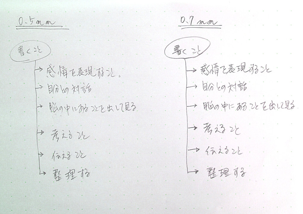 しかし、あるとき、0.5mmで書いていてなにかしっくりとこないものを感じた。その時はアイデアを色々と書いていたのだが、0.5mmで書いたアイデアがなんとなく自信がなさそうに見えたのだ。自分としては、これはいいぞ!と思ったのに、書いてみるとそれがそうは見えてこなかった。