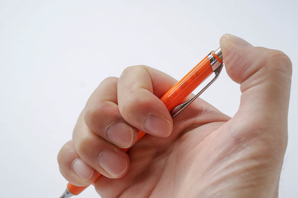 まず、ノックを押してみる。ノック音がこれまでの「オレンズ」よりも静かなことに気づく。従来のものは「カチカチ」と高い音がしていたが、ラバーグリップの方は「カチカチ」というよりも「プチプチ」という控えめな音。