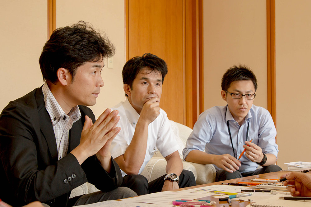 「オレンズ」のプロダクトデザインを担当した商品開発本部 デザイン室 プロダクトデザイングループ 柴田智明さん(写真左)