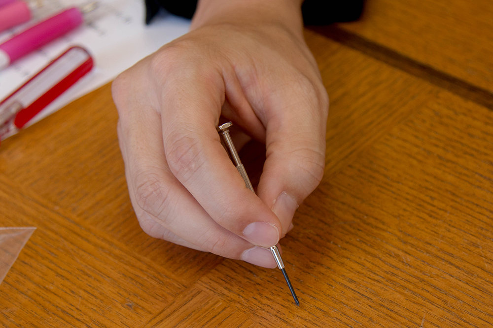 これによりなにが良いかというと、芯が常にまっすぐに送り出されるようになる。チャックが開く直径が大きいと、そのすき間に芯が入り込んでしまうことがある。特に「オレンズ」のように0.2mmや0.3mm細い芯の場合は、こうした点も気をつけないといけないのだという。