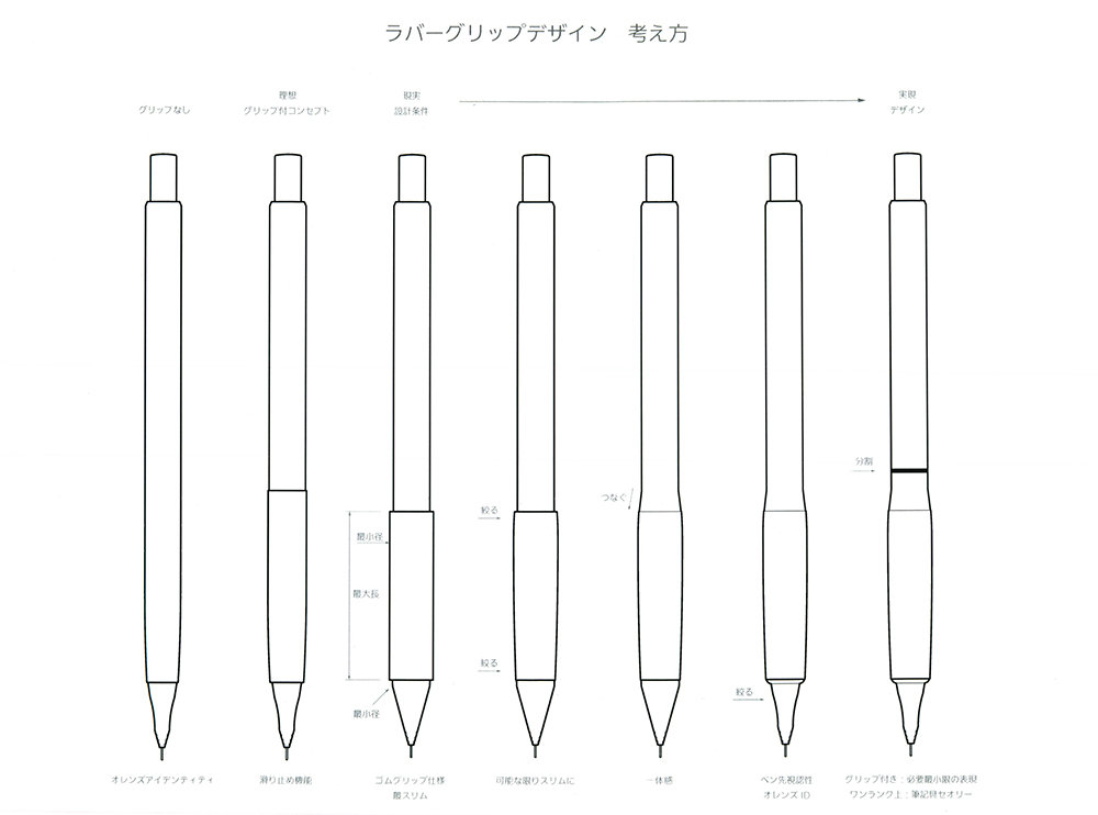 「オレンズ」のメインユーザーは中高生。勉強で長時間快適に書きたいのでラバーグリップを付けて欲しいという要望が数多く寄せられていた。それを受け「オレンズ」にラバーグリップタイプが登場した。