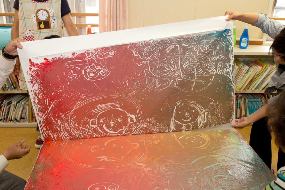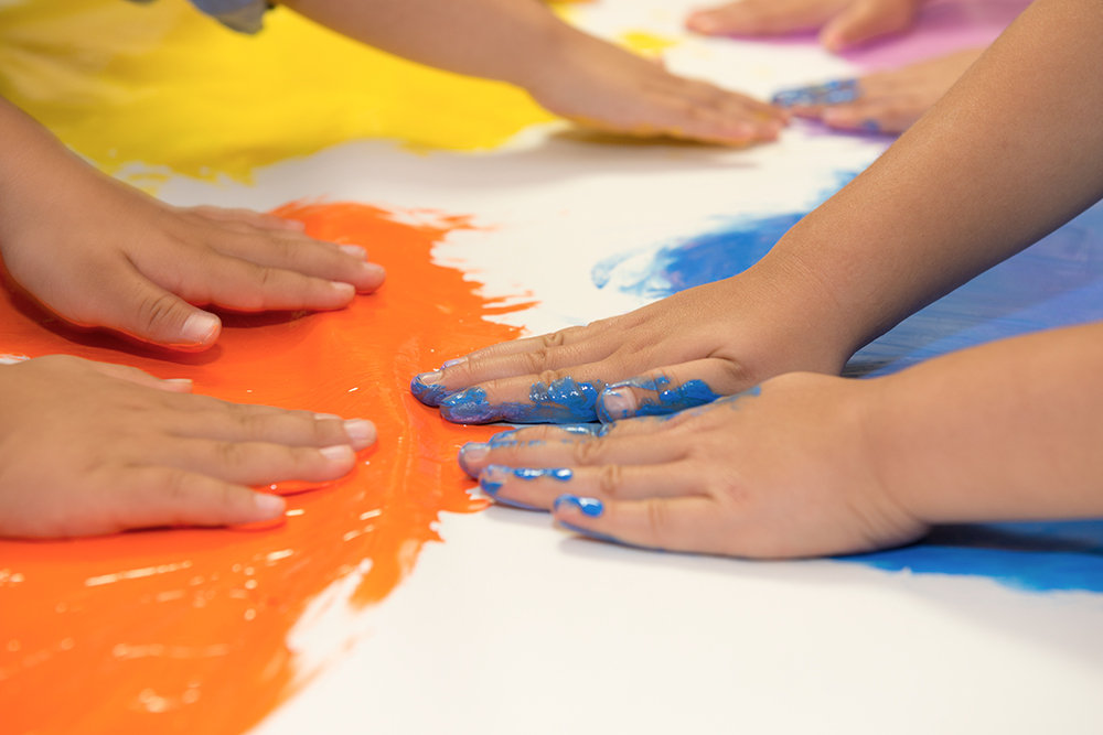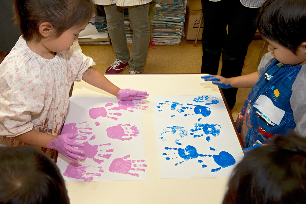 小さいお子さんにとって筆を使って描くのはなかなか難しい。上手にできる子もいれば、出来ない子も出てきてしまう。指や手であれば、そうしたことがなく、誰でも自由に描ける良さがある。ちょうどこどもが地面に指で何かを描くのに近いものがあり、こどもが大好きなどろんこ遊び的要素もあって、こどもに最適な創作遊びである。