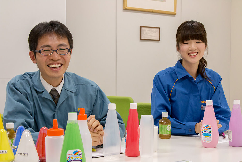 「ゆびえのぐ」の開発を担当した、ぺんてる 商品開発本部 画材企画開発部 画材開発課 黒沢 洋介さん(左)鎌田 理沙さん(右)。