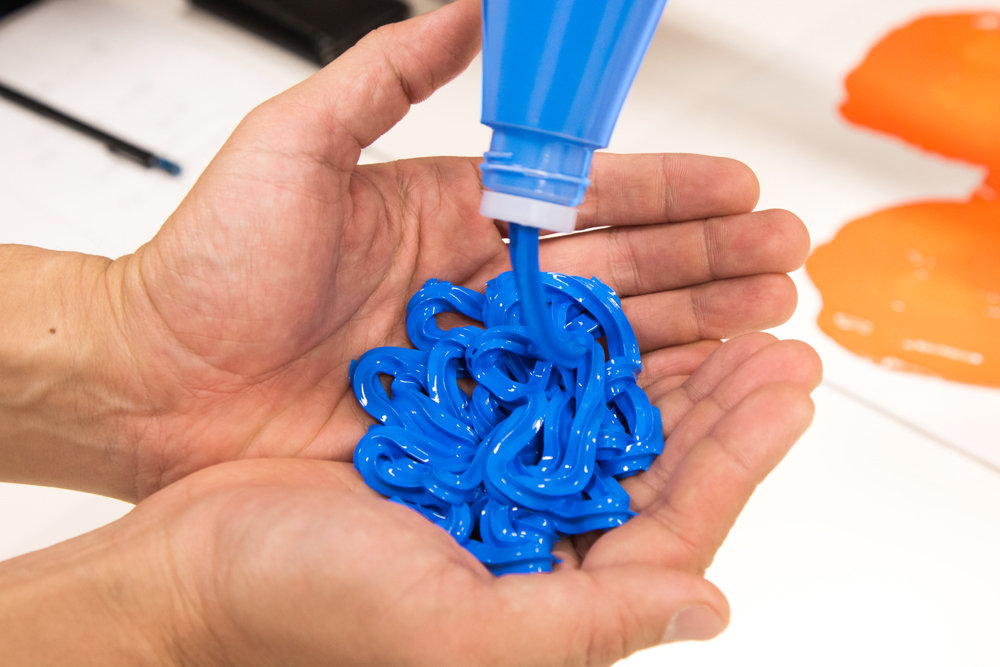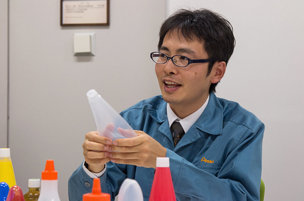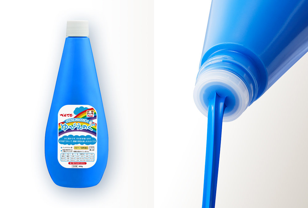 ぺんてるが採用したマヨネーズ容器なら、それこそマヨネーズを出す時のように容器を握ればグニュッと簡単に出すことができる。マヨネーズと同じで口も星の形をしているので、こどもたちにも好評だ。