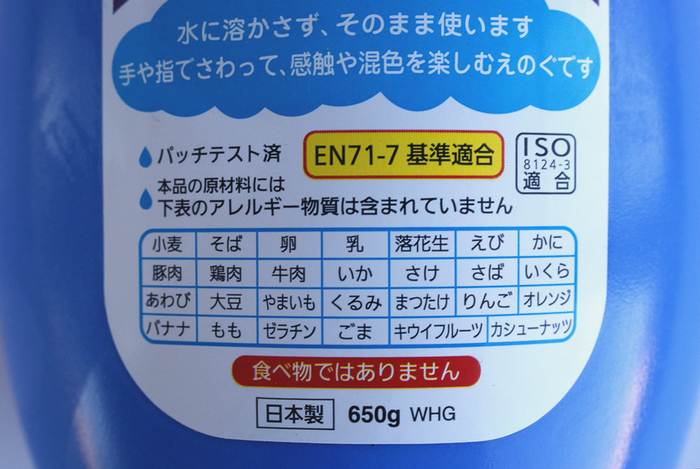 世界で最も厳しいと言われるヨーロッパの「EN71-7」という基準がある。「EN71」とは玩具の安全性を定めた規格だ。使ってはいけない物質が厳格に定められている。最後にある「-7」は「フィンガーペイント」のために定められた基準。なんとヨーロッパでは「フィンガーペイント」だけの基準がある。それほど多くのこどもたちに親しまれているということなのだ。