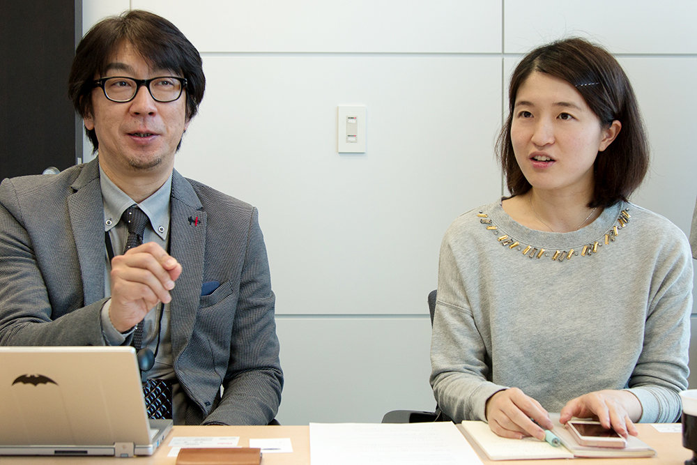 今回の「スマ単」をぺんてると一緒に作り上げたプラス株式会社 マーケティング統括本部 製品事業本部 副本部長 松本 竹志さん(左),マーケティング統括本部 第一製品事業部EOS・紙製品グループ 主任 春名 美沙さん(右)。ちなみに、松本さんのお子さんは、この春第一志望の大学に合格された。その際に「スマ単」を使って受験勉強をされたという。