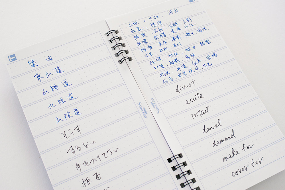 1つの行の中には約5mmのドット罫があり、細かく書けば文字を3行分が書き込める。単語帳としては珍しいノートスタイルにしたことで細かく書く時も快適に行えるようになっている。これまでの単語帳だと、小さく分厚い単語カードの上に書く必要があり、書きづらさもある。しかし、「スマ単」はフラットなノートなので、手帳やノートのように書いていける良さがある。単語帳作りもスムーズに行えるのだ。