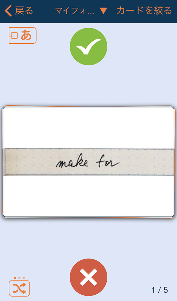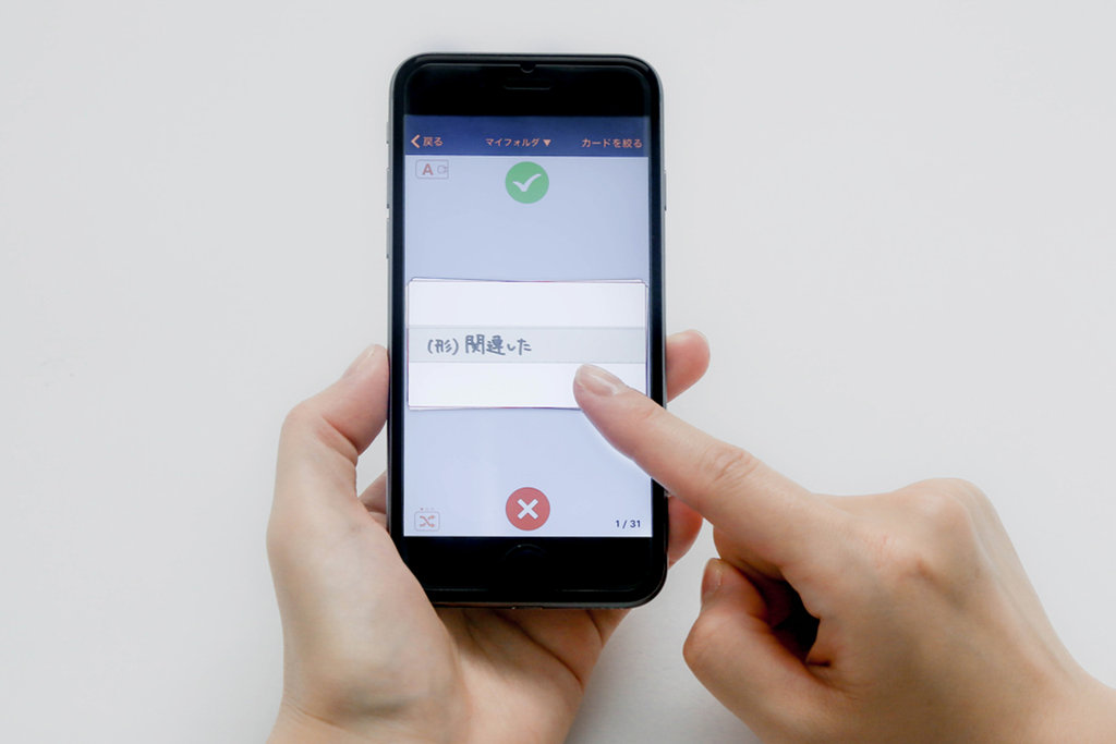 暗記する時は、スマホに単語カードを表示させて自分で答えてタッチしてカードを裏返す。このインターフェースが実にリアル。本当の紙のようにクルリと回転するので、見ていて楽しい。正解していれば、カードを上の「レ」に、間違ってしまった時は下の「×」にドラッグしていく。デジタルではあるが、非常にアナログ性に富んでいる。こうしたところはさすが使い勝手にこだわる文具メーカーによるものだ。