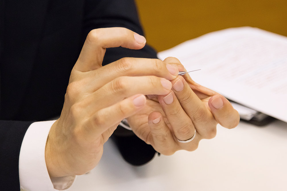 ところで、なぜ先端は3つに分かれているのだろうか?4つや2つでもいいような気もする。丸山博士いわく、シャープペンの替芯のような円柱状のものを保持するには3つで支える方がバランスが良いという。また、チャックはとても小さいパーツのため、4つにするとひとつあたりの強度が下がり故障につながる。逆に2つにすると、チャックを広げる時に硬くなり、その分強めのスプリングが必要になり、重たいノック感になってしまうそうだ。チャックが3つに分かれているのには明確な理由があった!ということである。
