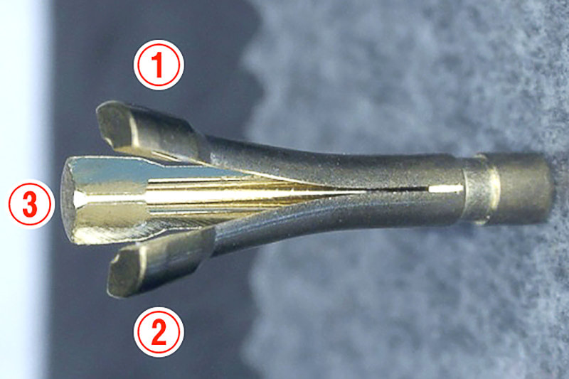 シャープペンを分解したことがある方ならご存じだと思うが、先端が3つに分かれているパーツだ。パーツが3つあるのか?と思いきや、実はひとつのパーツで作られている。芯をつかんだり、放したりする必要があるためだ。