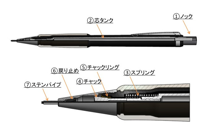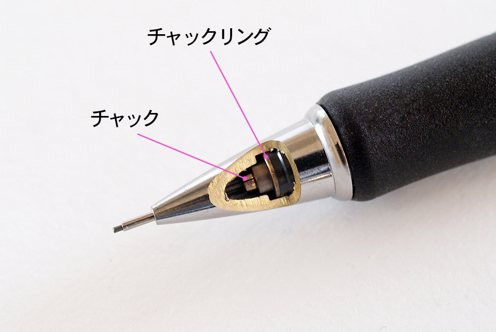 動画で観てみるとわかるが、ノックして芯を送り出すために「チャック」と「チャックリング」はエンジンのような働きを果たしている。