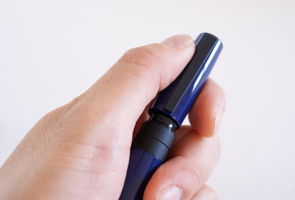 外したキャップは、どうやら後ろにささない方がよいようだ。その方がライティングポジションをとった時のバランスが決まりやすい。そもそも「ペンジャケット」のボディは少々長めなので、キャップをささずとも十分快適に握れる。