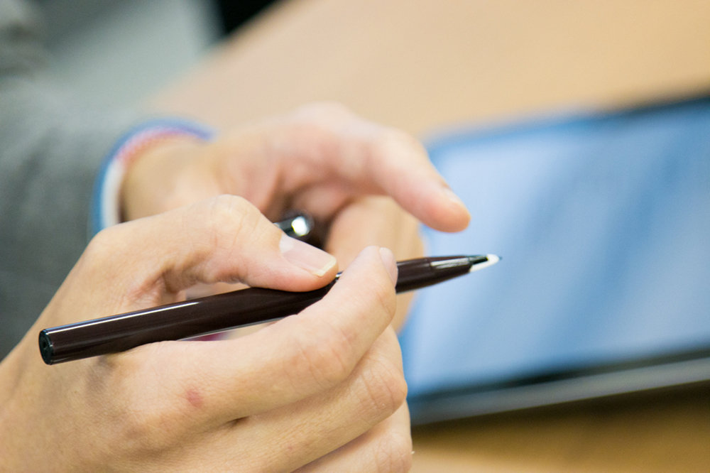 ペンの向きをかえて違う書き味を楽しんでいる「プラマン」