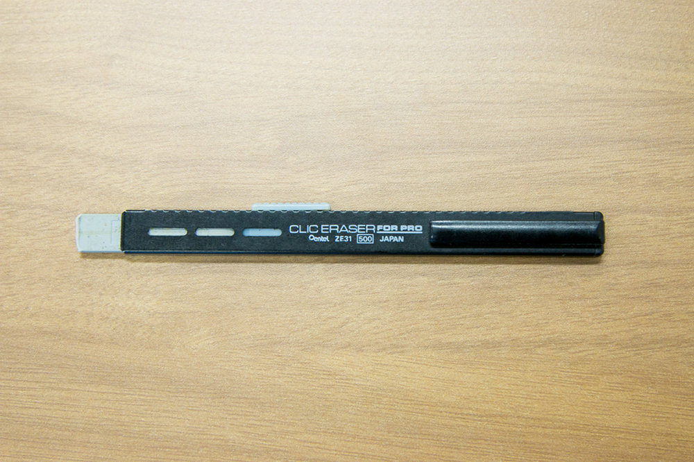 そして、これはとても永く使っていますと、ペンケースから取り出したのは使い込まれた「クリックイレーザー」だ。かれこれ10年も愛用しているという。消しゴムはよくある四角いタイプは使わず、この「クリックイレーザー」だけにしているという溺愛ぶり。