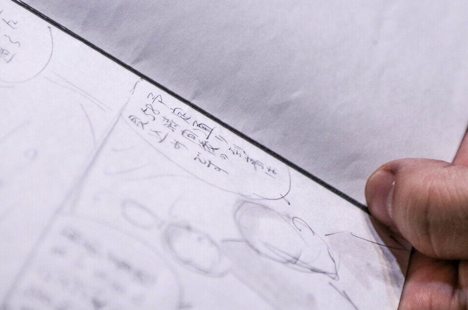 小山さんの創作は、「プロット」からはじまる。一話分の大まかな出来事をA4の紙に言葉だけで書いていく。ここではぺんてるの「サインペン」を小山さんはよく手にしている。内容によって色分けもしている。黒は出来事やこれから起こること、オレンジはキャラクターの心情、緑は情報といった具合だ。