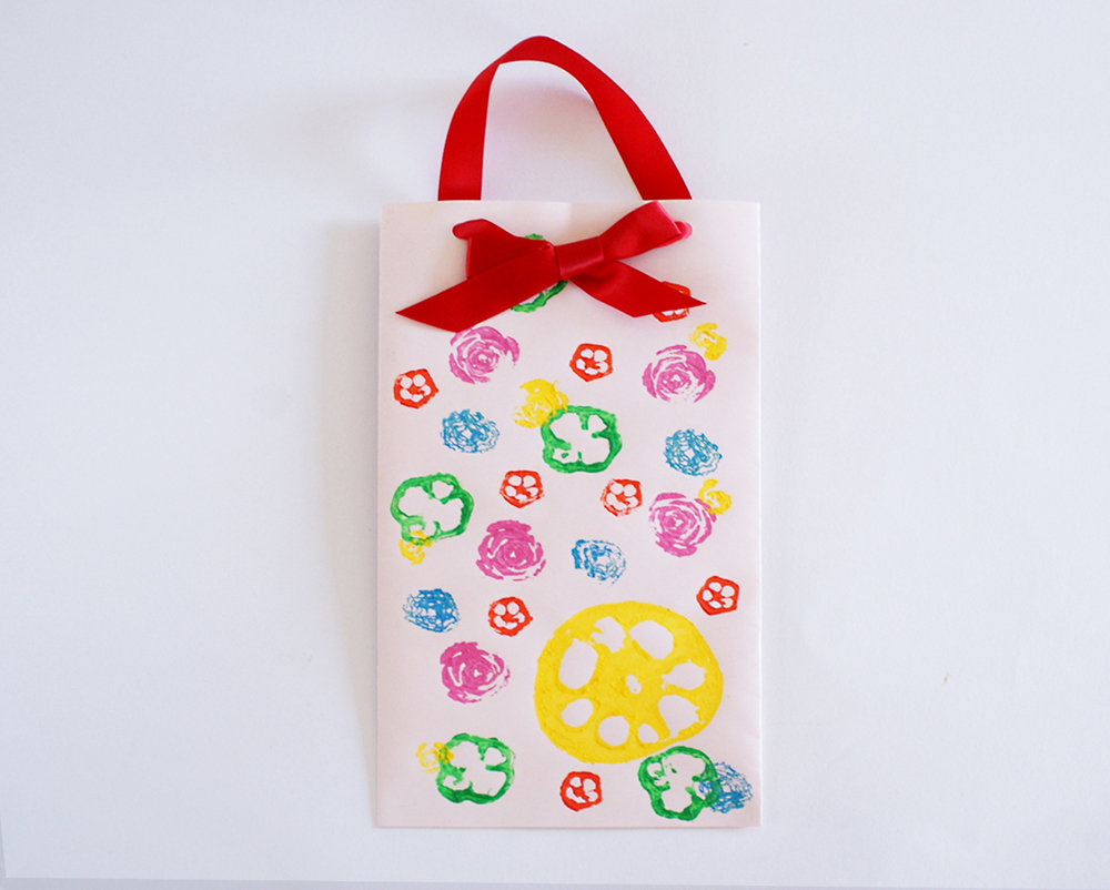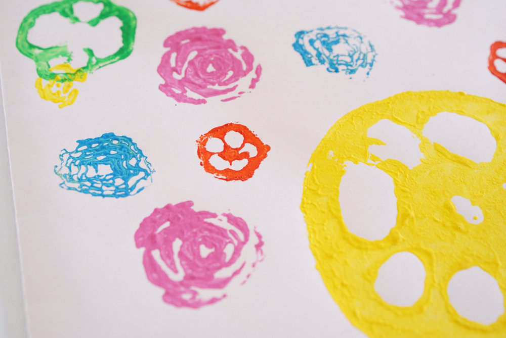 この色んな素材に描けるということを活かし、スポンジローラーに「共同制作えのぐ」を含ませて転がしながら描いたり、野菜の断面をスタンプにするといったことまで出来てしまう。