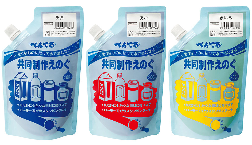 床やテーブルに付いた絵の具が落としやすく、子供の手や体についても簡単に洗い流せるので、幼稚園や保育園の先生方からとても好評だという。自由に描け、後片付けも楽という訳だ。