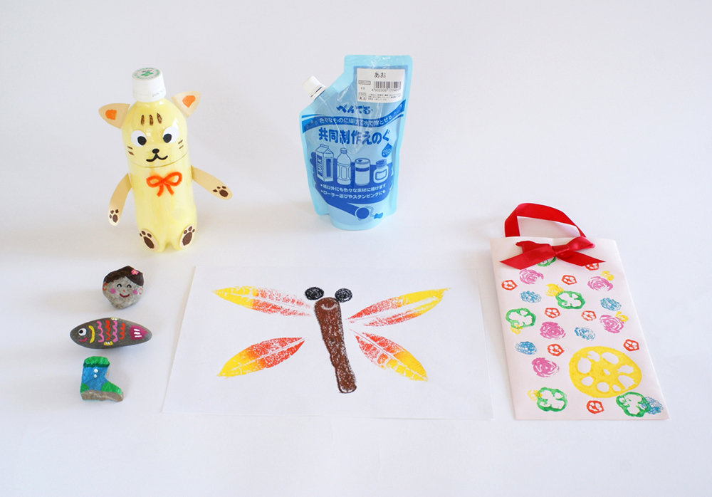 この絵の具の最大の特長は、紙以外の様々な素材に描ける点。たとえば、ペットボトル、牛乳パック、ガラス、段ボールといった表面がツルツルとしたところにも絵の具がはじかれることなくしっかりと描くことができる。